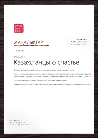 Следует отметить такой важный момент как акции и скидки. У нас они действуют почти всегда, например, если клиент заказывает создание видеороликов, он бесплатно получает анимированную заставку в подарок. Логотип выбирает заказчик. Кроме того, мы часто снижаем цены в рамках рекламной кампании, поэтому 90% клиентов – это потребители нашей продукции. Мы привыкли работать над проектами, где видеосъемка осуществляется в Алматы, причем заказчик всегда доволен, что это дешево и качественно.